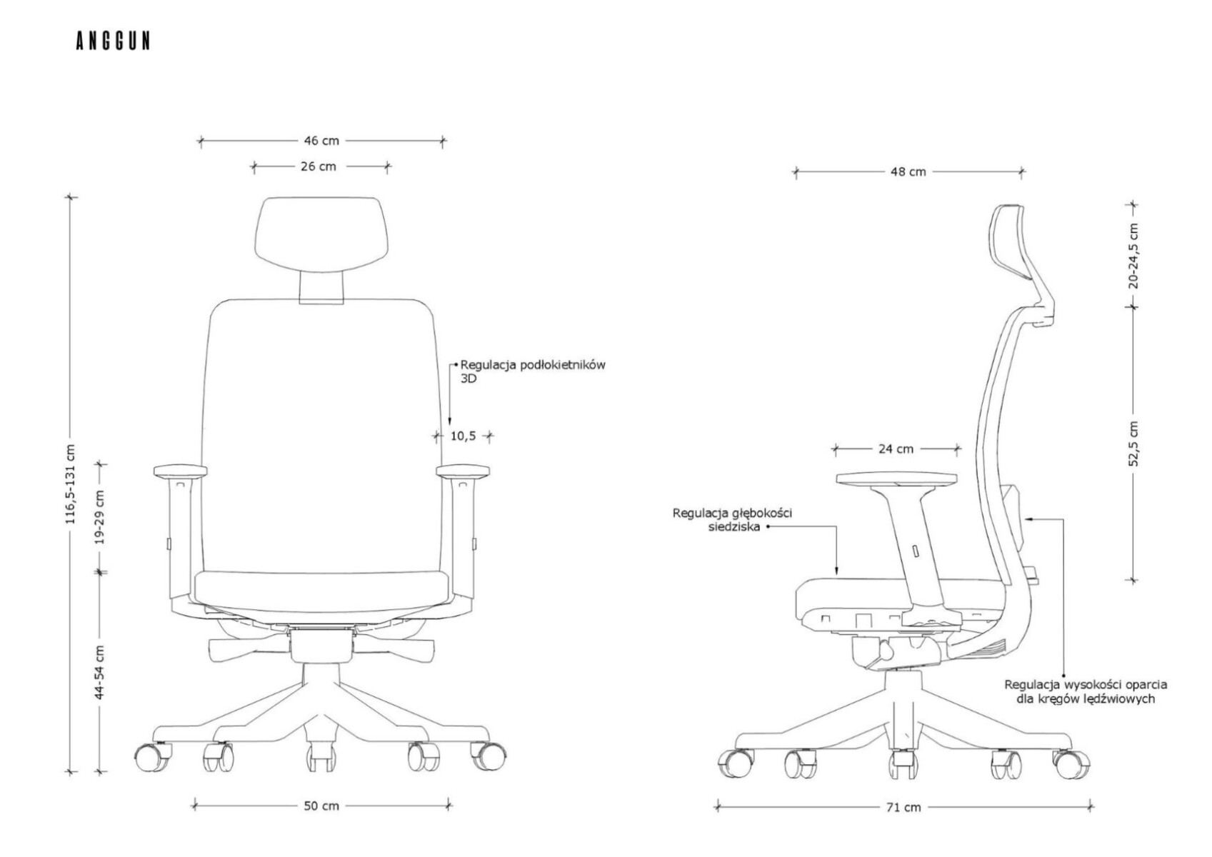Fotel ergonomiczny ANGGUN doskonale dopasowuje się do budowy ciała korzystającej z niego osoby. Posiada zaawansowane mechanizmy, które umożliwiają regulację głębokości i wysokości siedziska i pełną regulację podłokietników. Użytkownik może skorzystać także z regulacji wysokości oparcia dla kręgów lędźwiowych oraz regulacji wysokości zagłówka. W ten sposób każdy punkt ciała jest doskonale podpierany przez konstrukcję fotela, a ryzyko pojawienia się bólu spowodowanego długim siedzeniem jest minimalizowane.