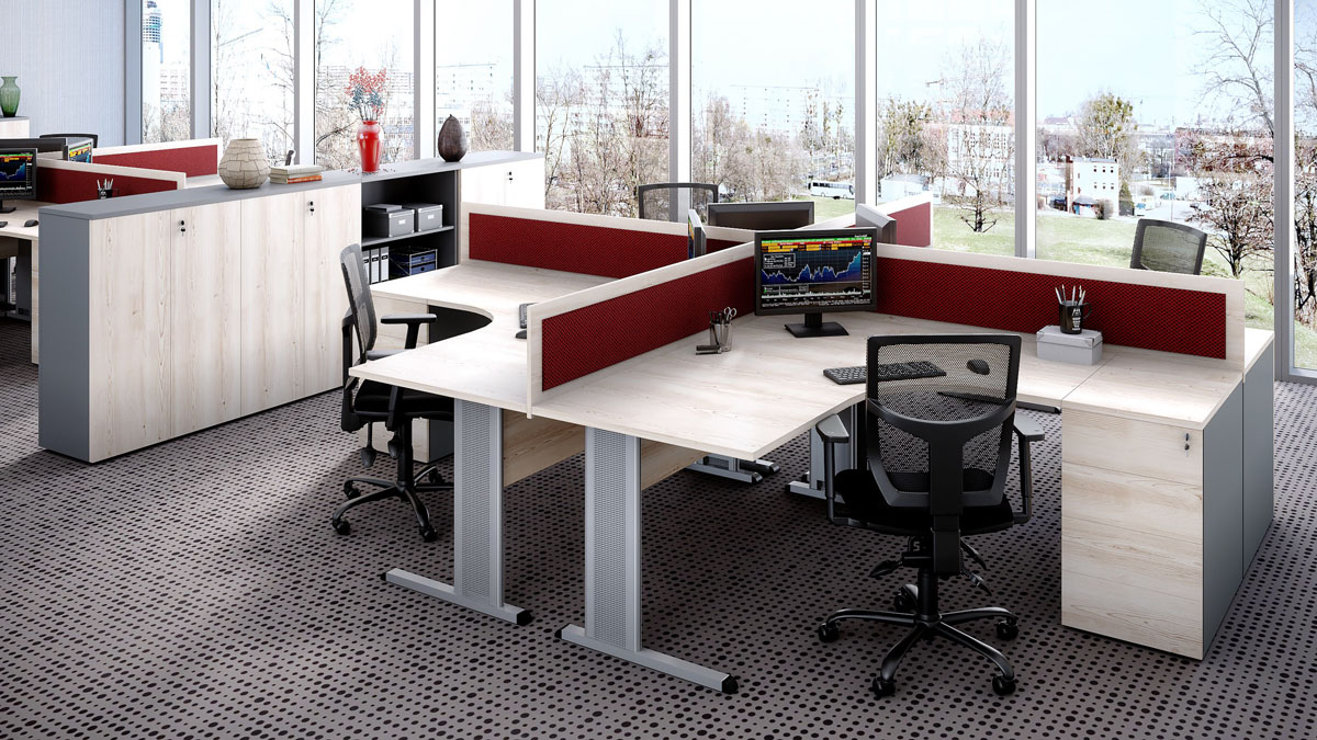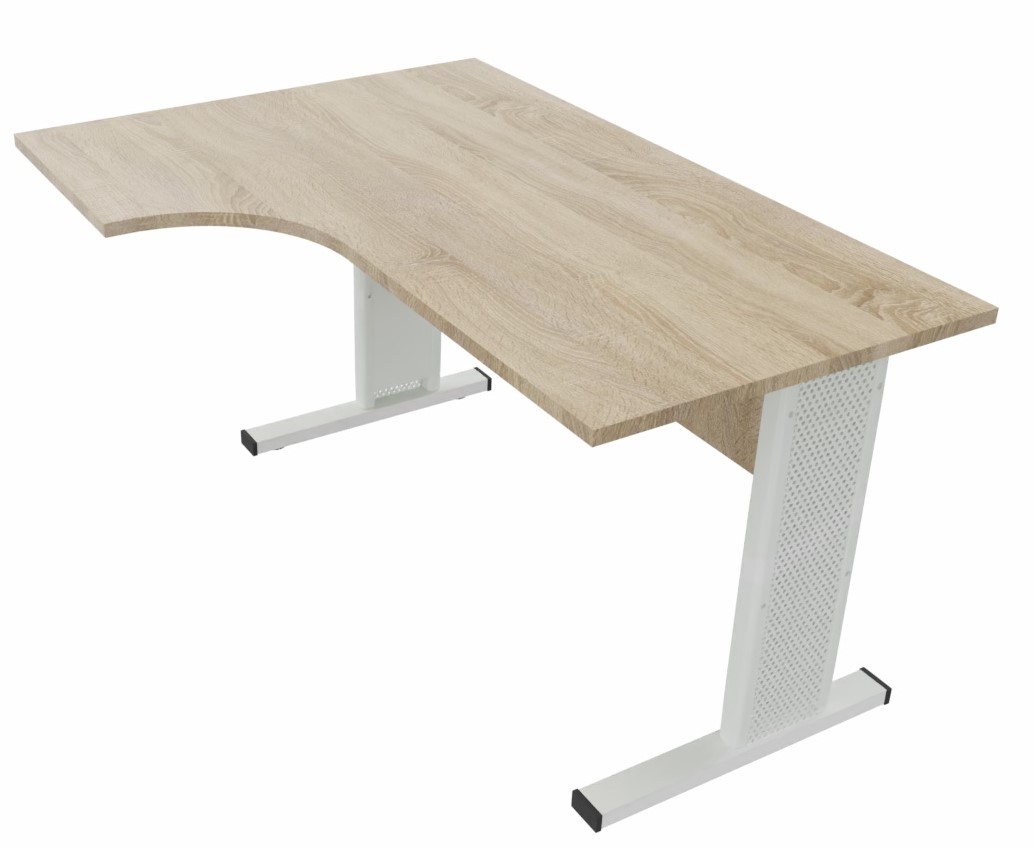Funkcjonalne biurka na stelażu metalowym, stopy w kształcie litery L z pionowym prowadzeniem kabli (zdejmowana osłona pozwala na schowanie okablowania ), od frontu blenda konstrukcyjna dla zwiększenia stabilności biurka.