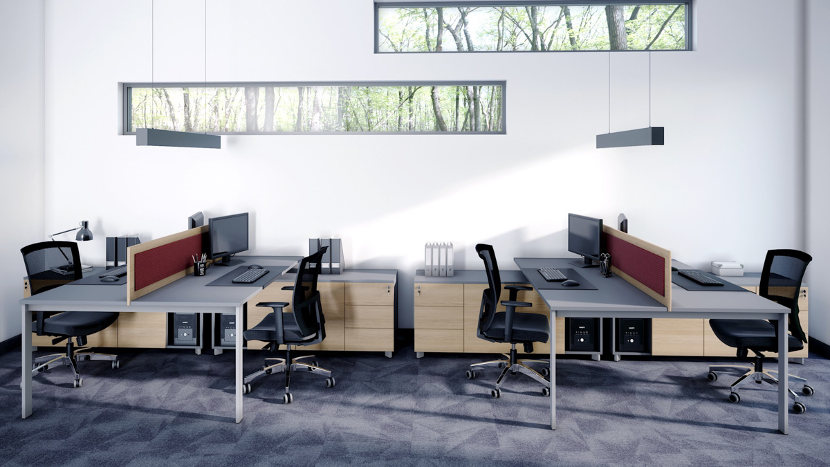 Biurka wsparte na szafkach podbiurkowych pozwalają na uniknięcie zbyt dużej ilości nóg, co ułatwia rozmieszczenie większej ilości stanowisk na niewielkiej przestrzeni.