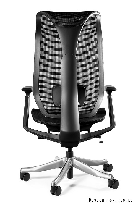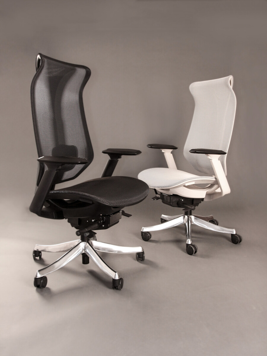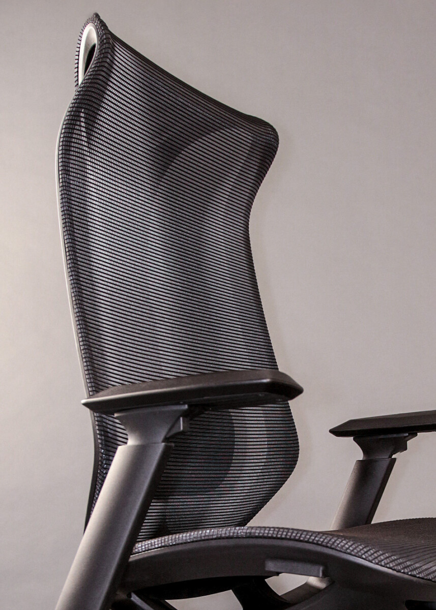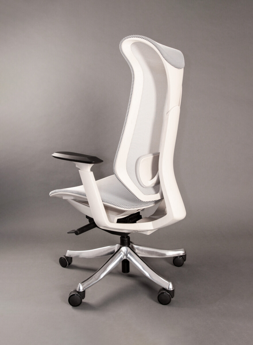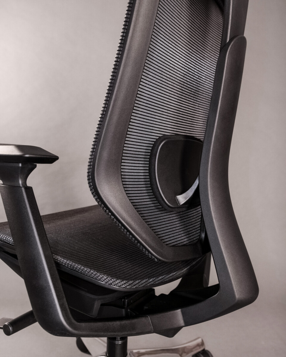 Profilowane oparcie z przewiewnej siatki wspiera naturalną krzywiznę pleców i poprawia cyrkulację powietrza, zwiększając komfort podczas wielogodzinnego siedzenia.