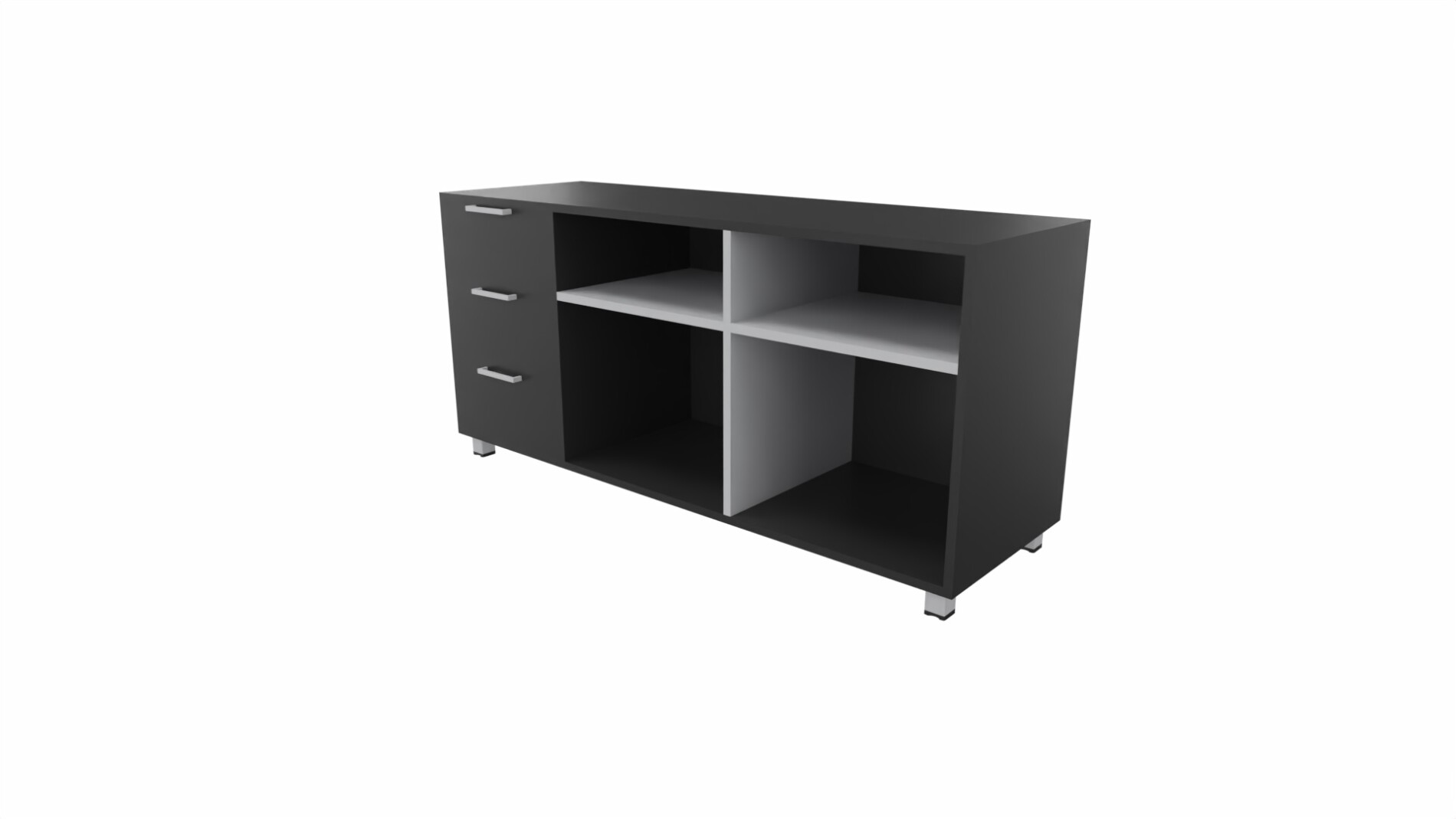 Szafki na metalowych stopkach , korpus, fronty szuflad, drzwiczki , plecy – wykonane z płyty  gr.18mm., dwustronnie melaminowanej o klasie higieniczności E1.Szuflady i drzwiczki zamykane zamkami. Uchwyty dwupunktowe rozstaw 128mm , prowadnice szuflad rolkowe.