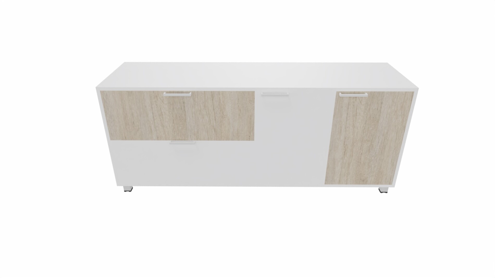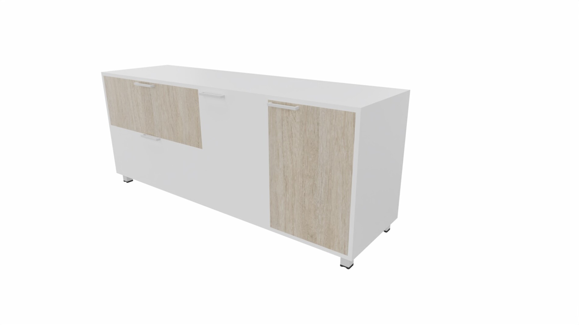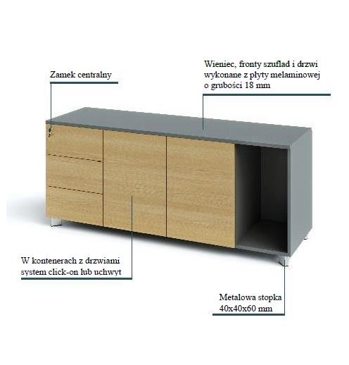 Szafki na metalowych stopkach , korpus, fronty szuflad, drzwiczki , plecy – wykonane z płyty gr.18mm., dwustronnie melaminowanej o klasie higieniczności E1.Szuflady i drzwiczki zamykane zamkami. Uchwyty dwupunktowe rozstaw 128mm , prowadnice szuflad rolkowe.