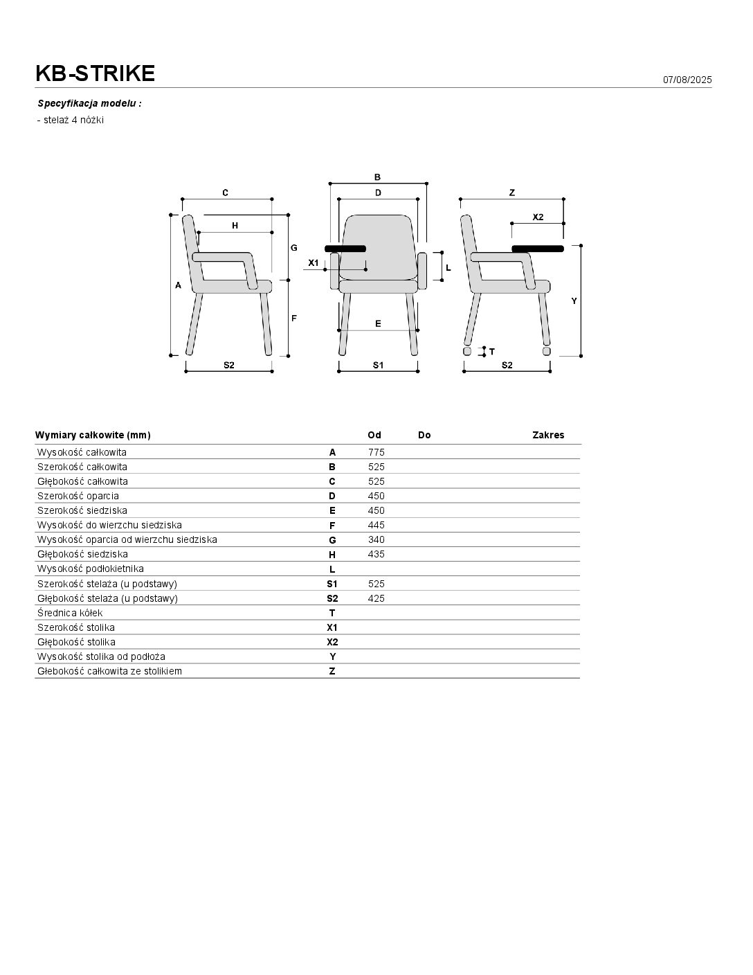 - stelaż 4 nóżki , materiał – stal , wykończenie – chrom