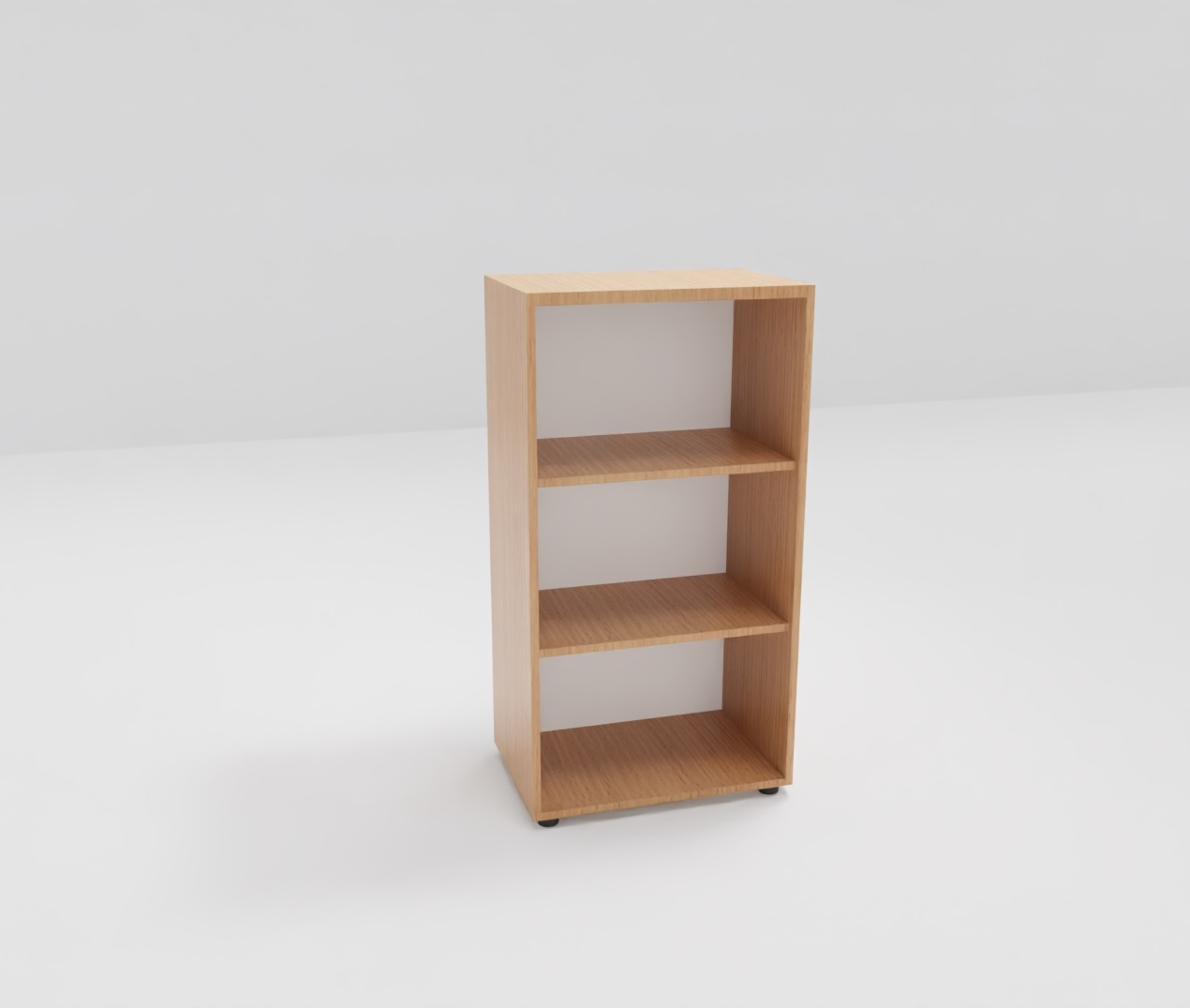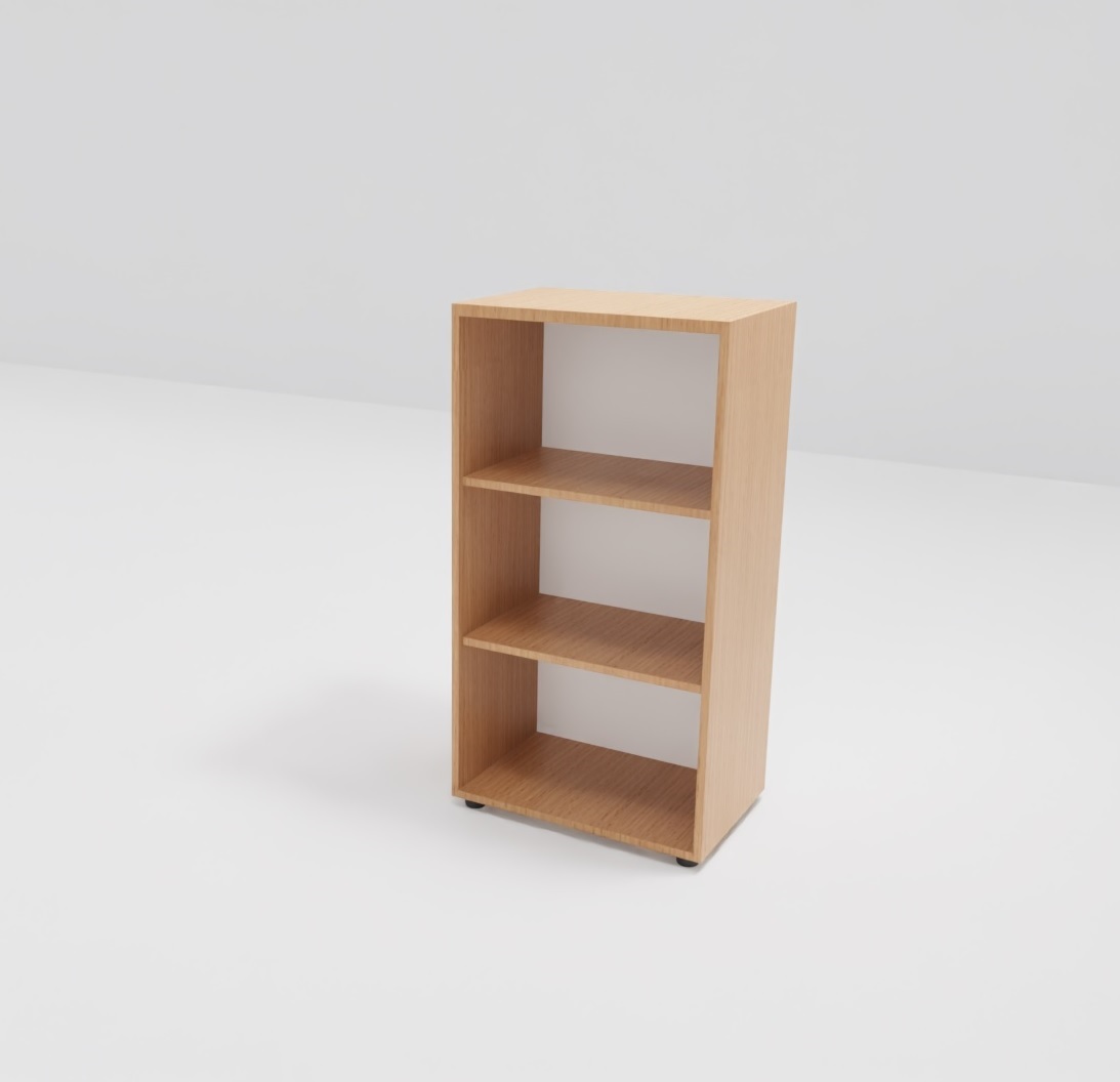 Regał z otwartymi półkami – 3 przestrzenie dostosowane do wysokości segregatorów.