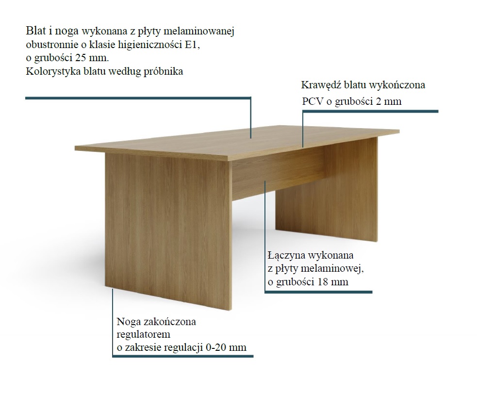 Blat oraz nogi wykonane z płyty gr.25mm., dwustronnie melaminowanej o klasie higieniczności E1. Krawędź blatu oraz nóg wykończona dookoła obrzeżem  PCV o grubości 2 mm.