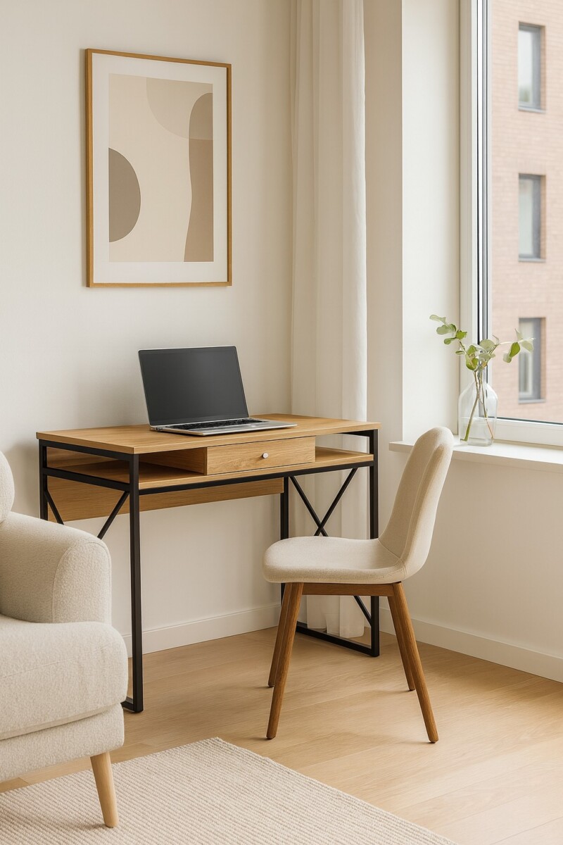 Pod blatem znajduje się praktyczna półka na najczęściej używane akcesoria – notatnik, kalendarz, telefon lub ładowarkę oraz niewielka szufladka na drobiazgi, które warto mieć zawsze pod ręką.